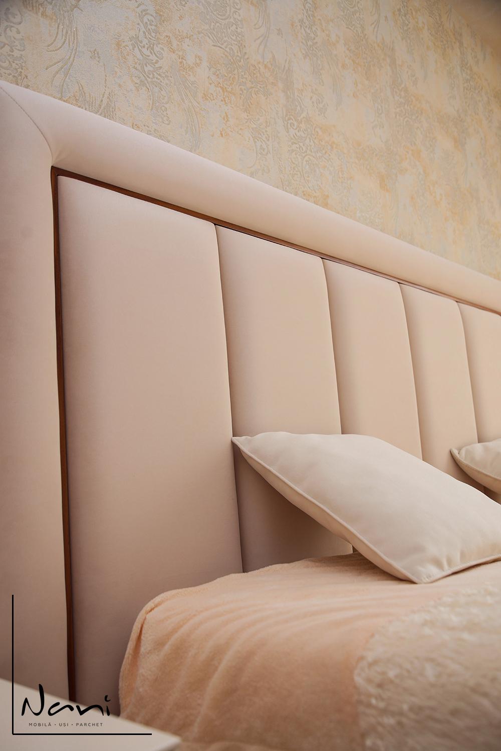 Apiani este realizat în stil modern cu elemente aurii din metal, care îi conferă un aspect luxos. Patul este tapiţat cu stofă de catifea, nuanţa o puteţi alege dintr-o gamă variată. Speteaza patului este uşor bombată şi ergonomică, lateralele sunt îmbrăcate în husă detașabilă, astfel pot fi uşor curăţate oricând aveți nevoie. Patul este dotat cu o ladă spațioasă de depozitare, elementele căreia pot fi uşor scoase, ceea ce face mai accessiblă curăţarea generală chiar şi sub pat. Carcasa patului este din metal cu lamele din lemn natural, ce păstrează proprietățile ortopedice ale saltelei. Dimensiuni 173x220 cm, 193x220 cm, 213x220 cm, 233x220 cm Spațiu de dormit 140x200 cm, 160x200 cm, 180x200 cm, 200x200 cm Ladă depozitară este Compoziție interiora PAL/LemnStofa/Poliuretan/Lamele Garanție 24 luni