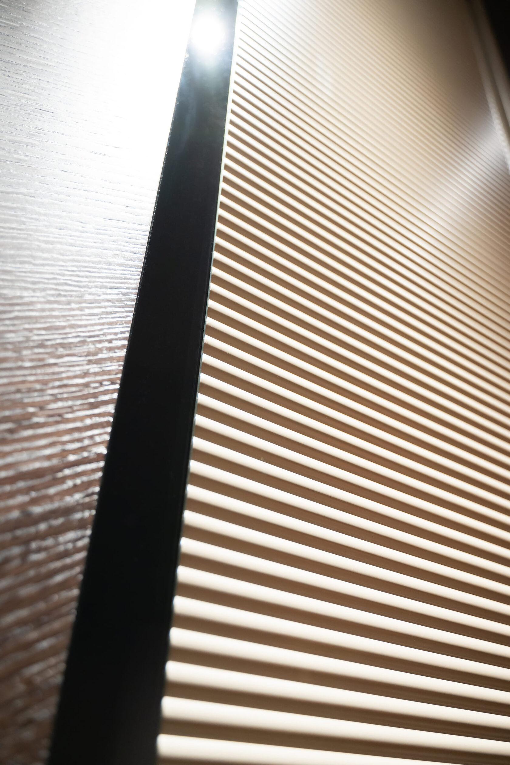 - Blat finisat cu furnir, sticlă Lacobel neagră și freze orizontale