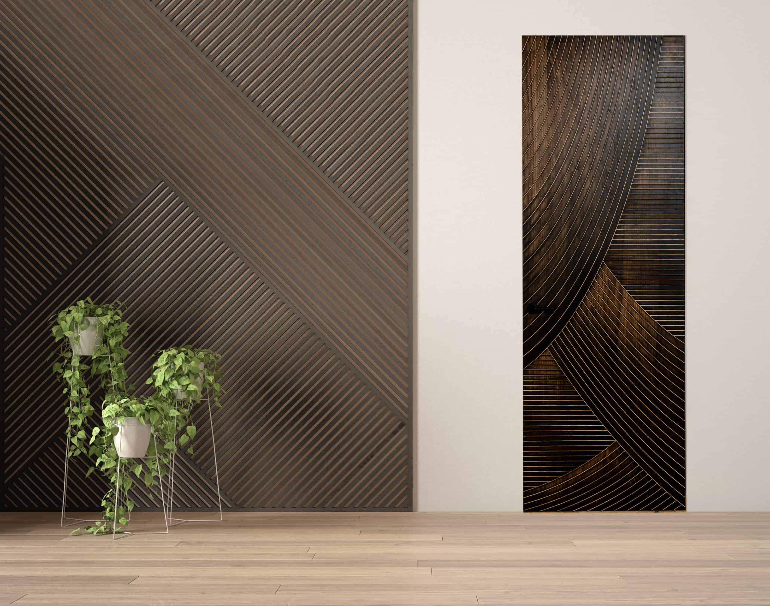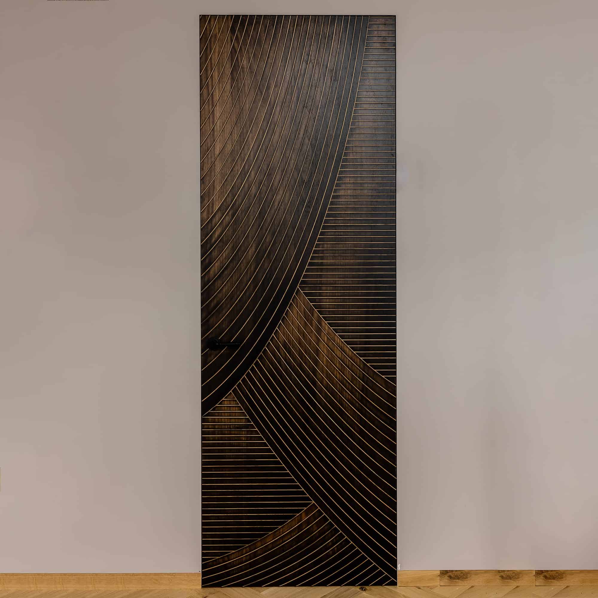 Благодаря широкому выбору текстур и цветов шпона, а также особенностям его обработки, мы можем наносить как тонкие, так и выразительные фрезеровки — в виде линий, фигур и абстрактных форм — по всей поверхности дверного полотна.